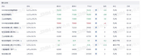 证券之星新能源车行业周报:据上海有色网,截止2月14日,电池级碳酸锂7.53-7.72万元/吨,均价7.625万元/吨,环比上一工作日下跌200元/吨;工业级碳酸锂7.29-7.39万元/吨,均价7.34万元/吨,环比上一工作日下跌50元/吨。碳酸锂现货价格重心持续下移。从当前市场成交情况来看,部分下游材料厂仅以刚需补库成交为主,整体采购意愿较为薄弱,多处于谨慎观望态度。考虑后续国内碳酸锂产量与海外进口量级均有一定增量,预计2月国内碳酸锂将持续过剩格局,碳酸锂现货价格将呈下跌趋势,同时伴有区间震荡。